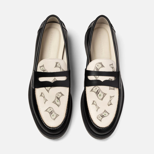 Part of Ace High, these Wilde Loafers are screen-printed with dollar bills on the vamps, hand-drawn by in-house artist, Jess. An update on our signature duotones, they’re handmade from black and white leather.